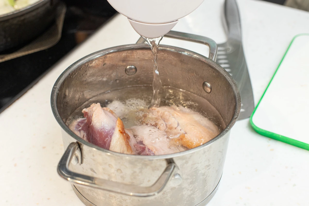Окорочка утки помойте, разрежьте пополам. Положите в кастрюлю и обжаривайте на среднем огне до золотистого цвета 5-7 минут. Залейте окорочка водой так, чтобы она полностью их покрыла. Тушите на среднем огне примерно 30 минут. Когда вода в кастрюле с уткой выпарится наполовину, накройте кастрюлю крышкой и продолжайте тушить на среднем огне ещё примерно 30 минут до полного размягчения утки — мясо должно легко отделяться от костей.