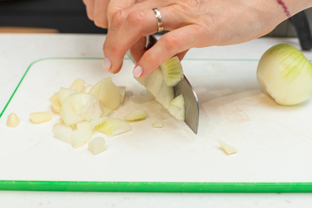 Пока готовится утка, почистите лук и чеснок, нарежьте произвольно, но не мелко. Разогрейте сковороду с оливковым маслом, выложите в неё лук и чеснок и готовьте, периодически помешивая, на среднем огне 5-7 минут.