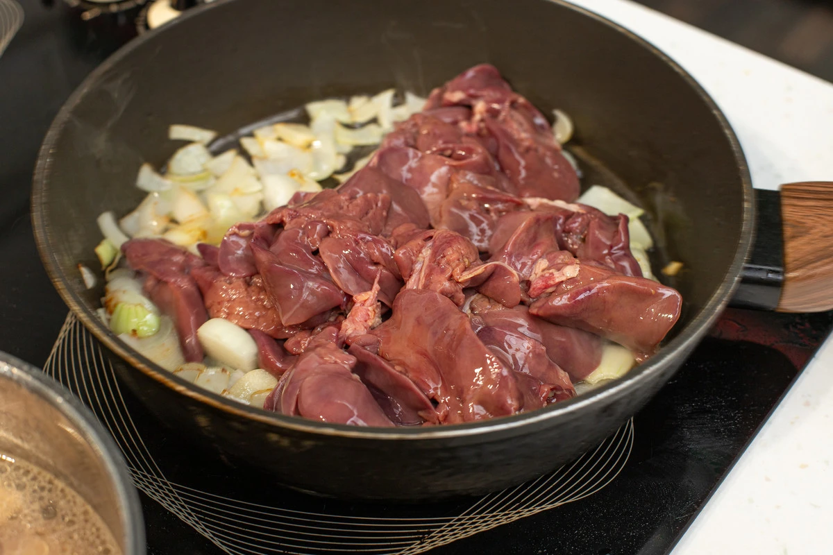 Промойте печень, срежьте желчные протоки, если они есть, и выложите в сковороду с луком и чесноком. Добавьте соль, поперчите по вкусу, перемешайте и готовьте на среднем огне 20-25 минут, иногда помешивая. Когда печень будет готова, немного остудите её.