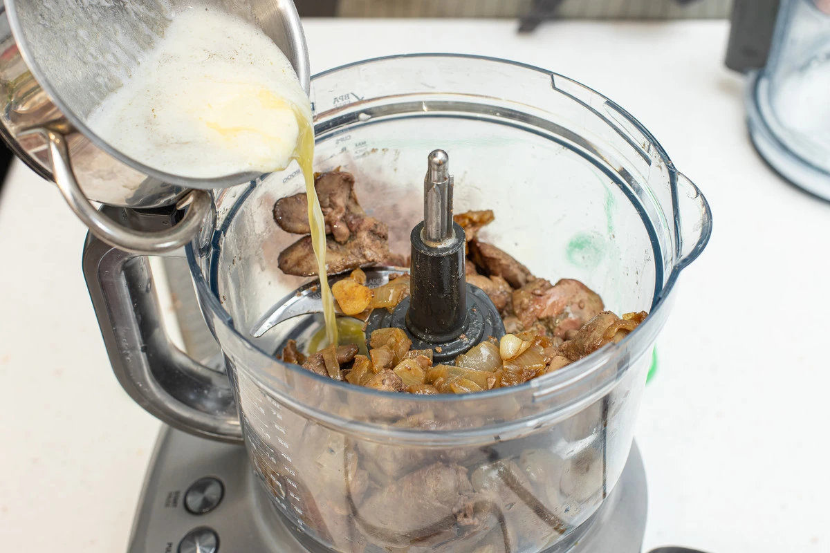 Слегка остывшую печень выложите в чашу комбайна или блендера, добавьте растопленное сливочное масло, чёрный молотый перец по вкусу и измельчите до однородности.