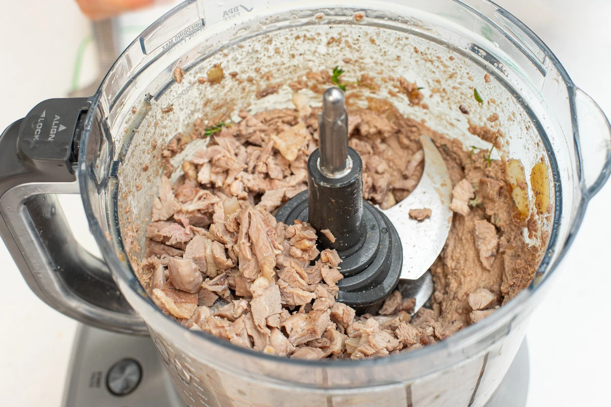 Добавьте несколько листиков тимьяна, утку и пробейте в блендере в два этапа по 5-7 секунд так, чтобы мясо птицы осталось небольшими кусочками.