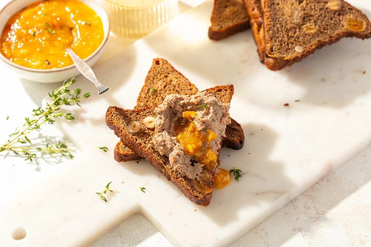Риет из печени с уткой идеально сочетается со сладковатым фруктово-медовым хлебом и мандариновым вареньем. Такие треугольные бутерброды внесут свою изюминку в ваше праздничное меню или обед в кругу семьи. И, что немаловажно, вы приготовите этот вкусный риет, даже если у вас нет духовки — например, на даче.