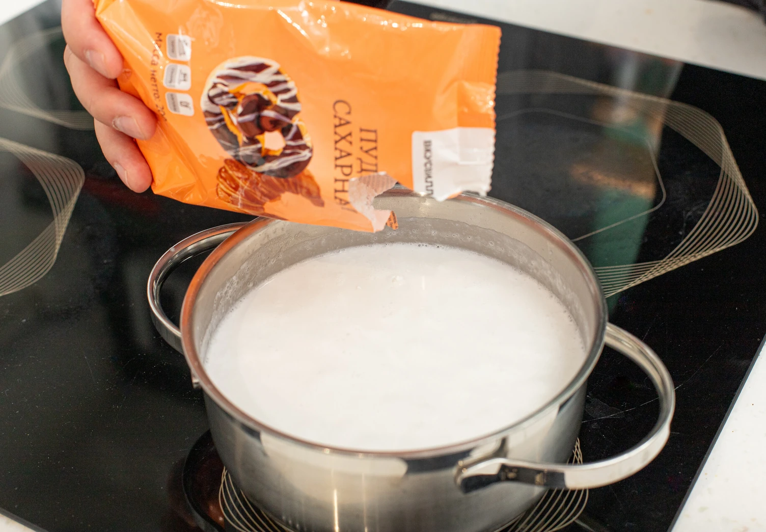 Варите рисовую кашу на смеси воды, кокосового молока, сахарной пудры и ванили на медленном огне в течение 15–20 минут.