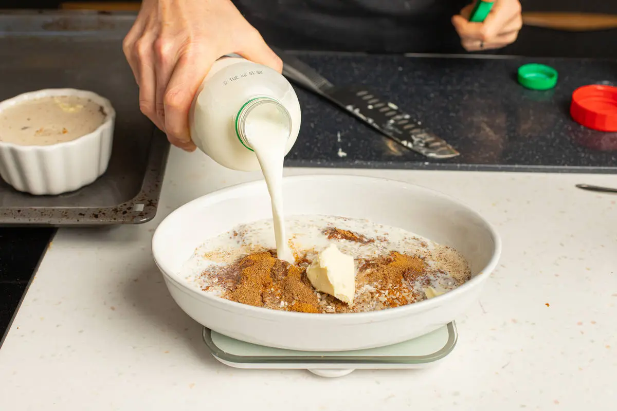 В рецепте используются товары из категорий: Крупы, макароны, мука; Масла, соусы, специи, сахар и соль; Молочные продукты, яйцо; Орехи, чипсы и снеки