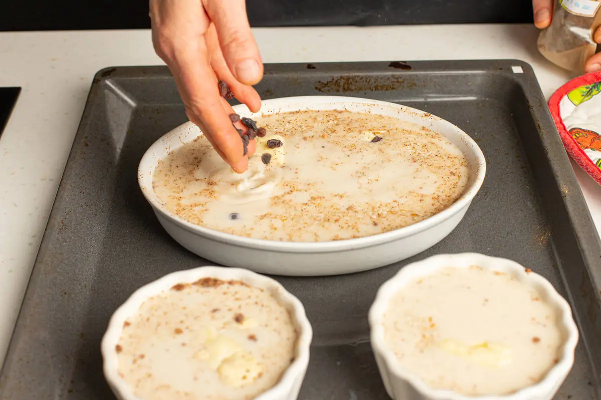 Изюм промойте и добавьте в форму. Сверху выложите нарезанное тонкими ломтиками сливочное масло.