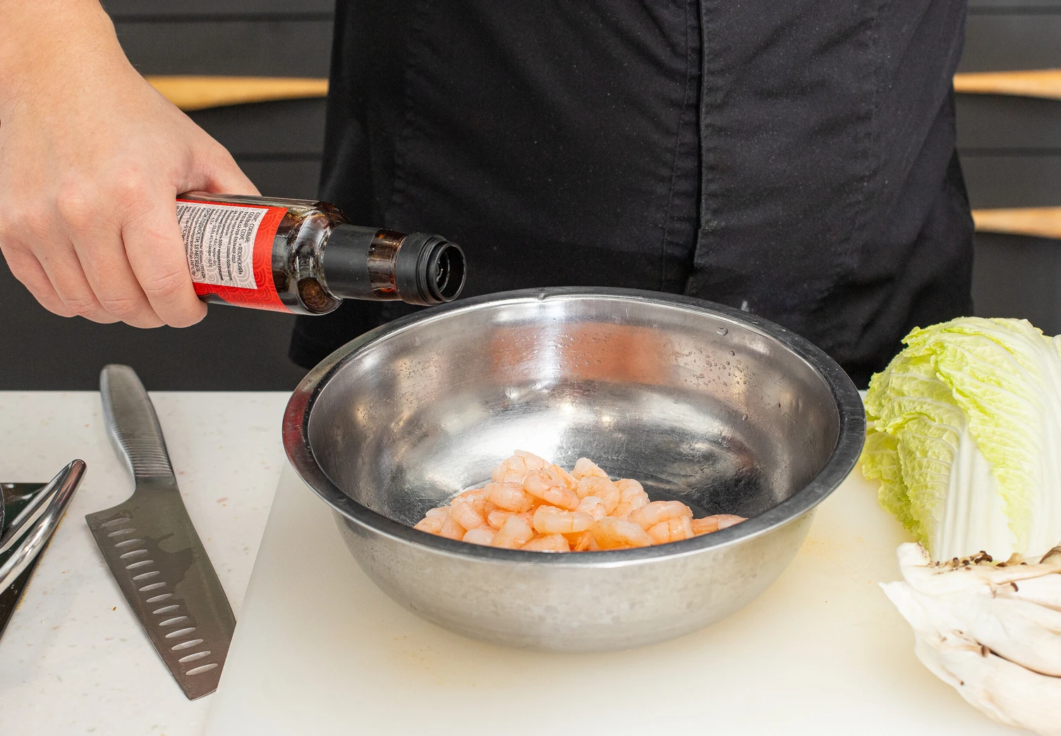 Смешайте креветки с солью, паприкой и чайной ложкой соевого соуса. Оставьте мариноваться на 15 минут, затем обваляйте в крахмале.