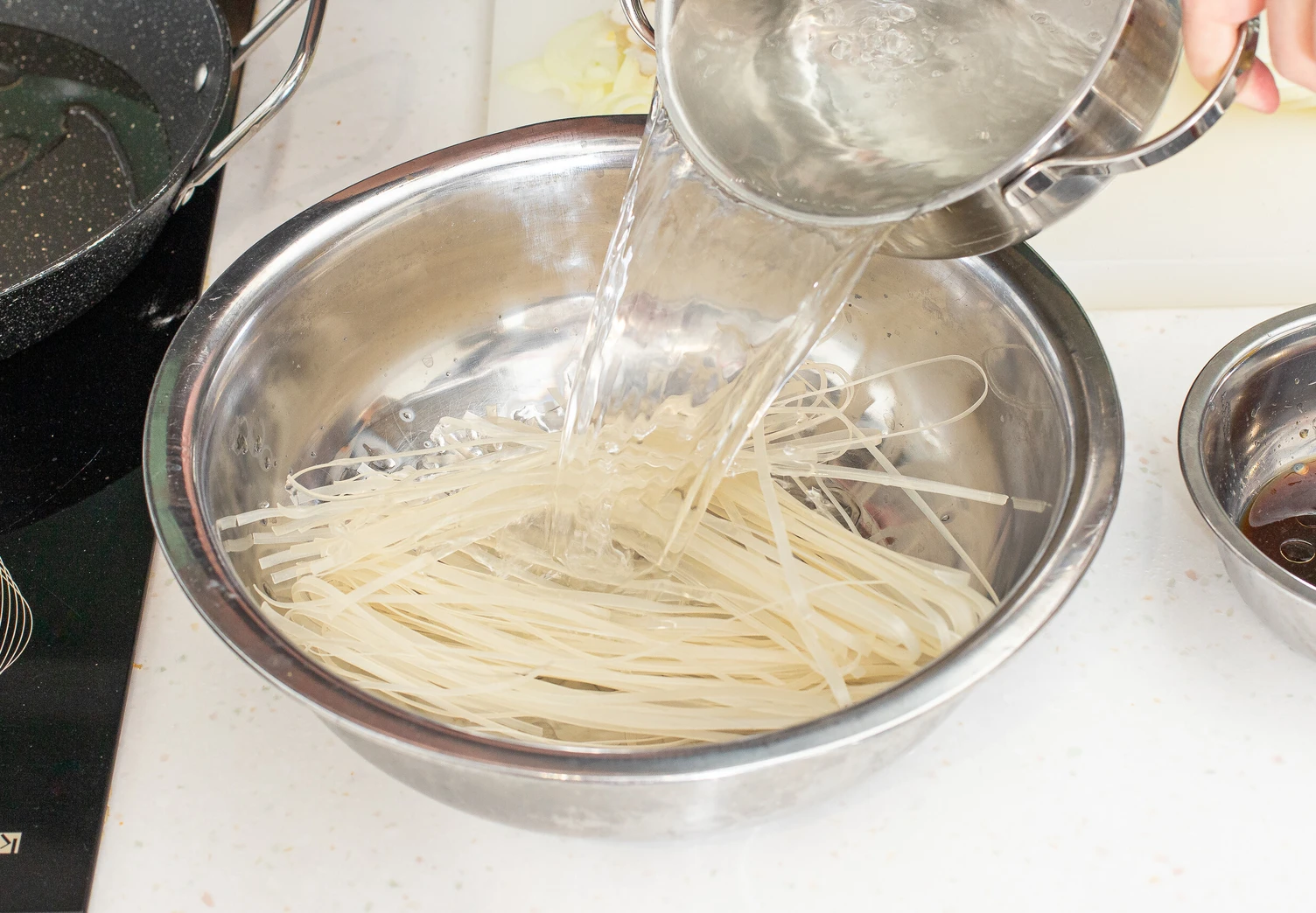 Залейте рисовую лапшу кипятком и оставьте под крышкой на 20 минут