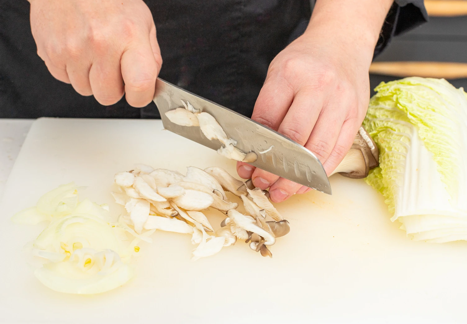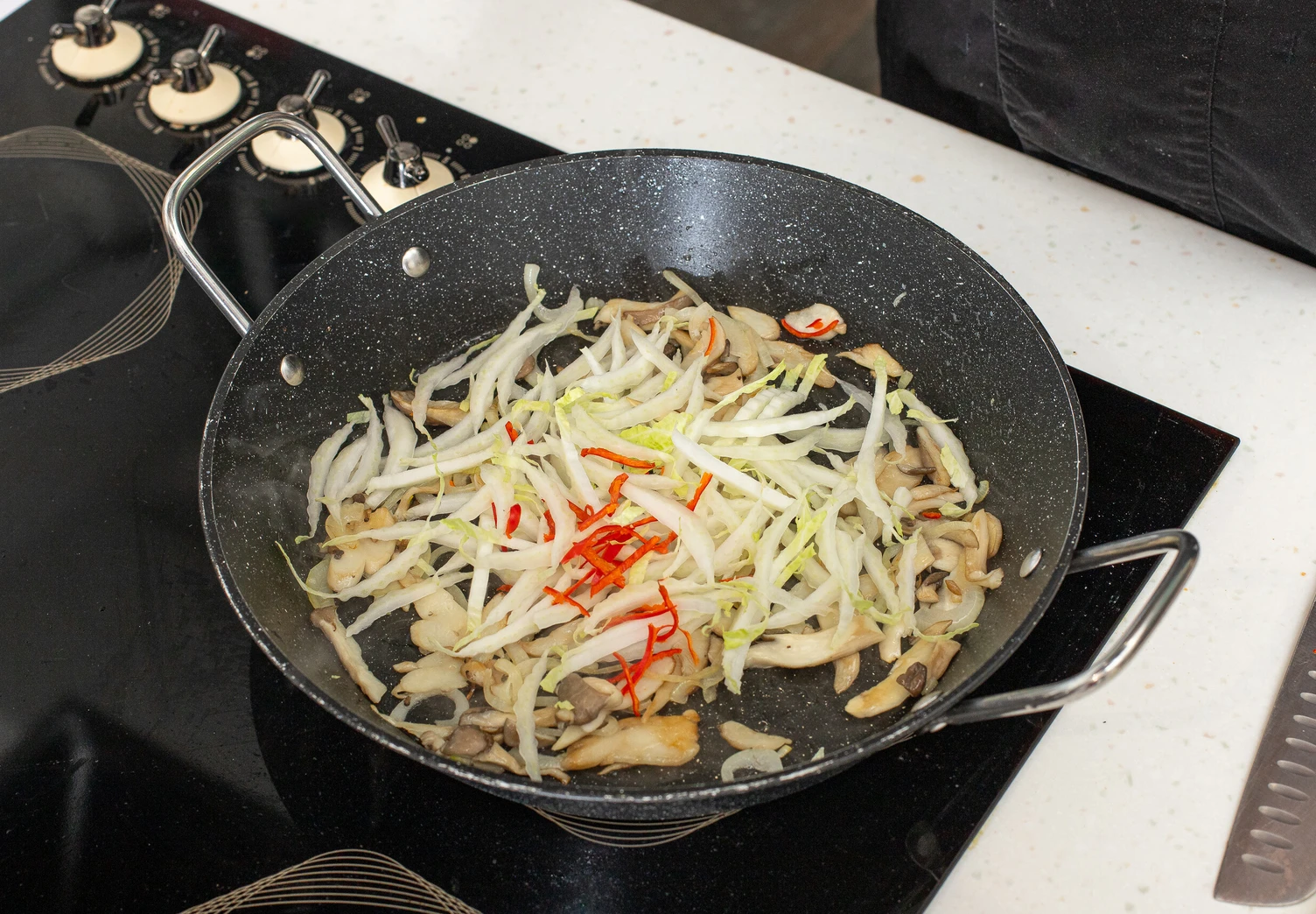 Лук, капусту, чили и грибы порубите тонкой соломкой.