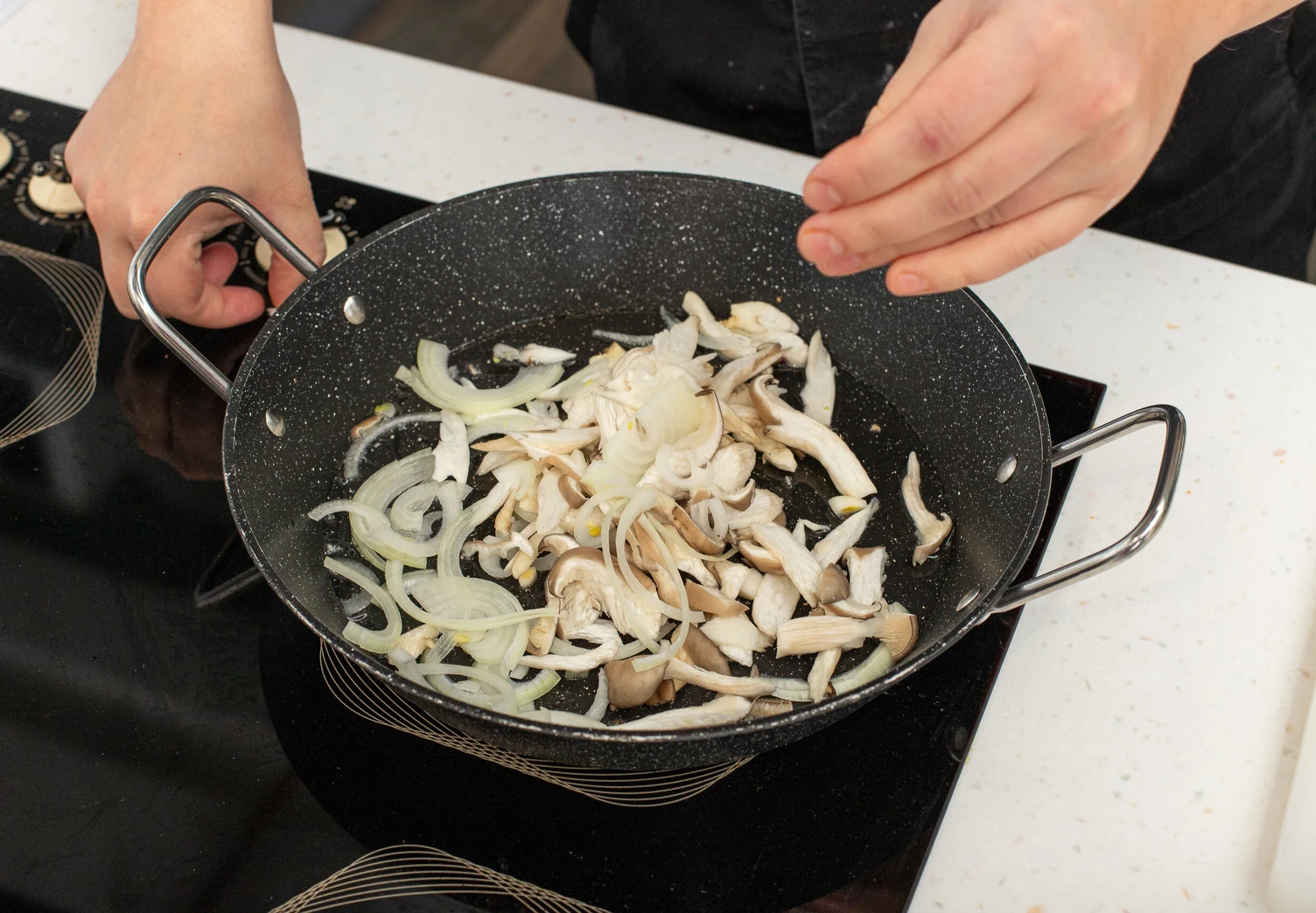 На сильном огне обжарьте лук и вёшенки в течение 3–4 минут.