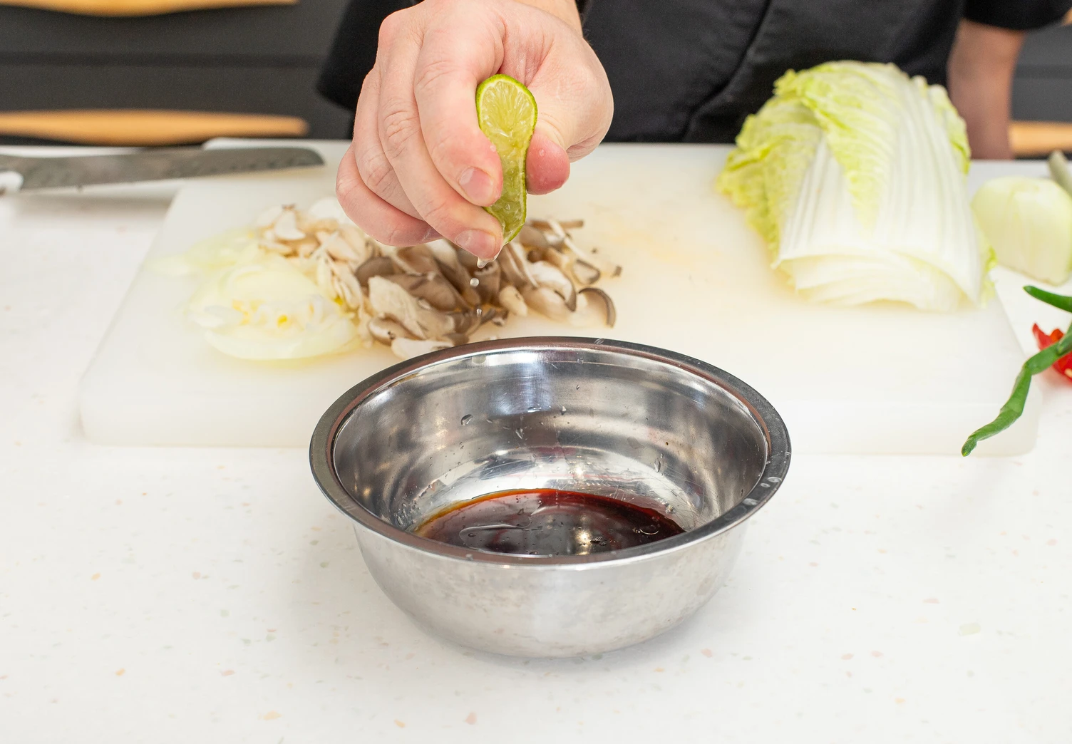 Смешайте в миске сухой чеснок, соевый и устричный соусы, сок лайма и кунжутное масло.