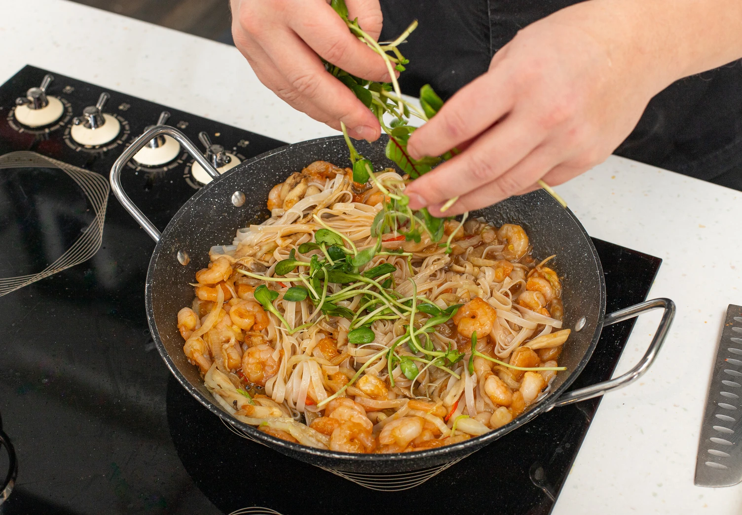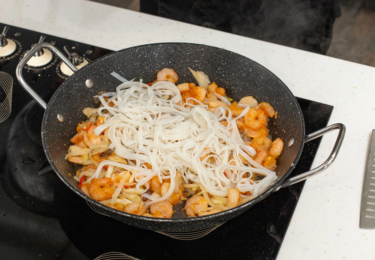 Выложите в сковороду распаренную рисовую лапшу, перемешайте и выключите огонь.