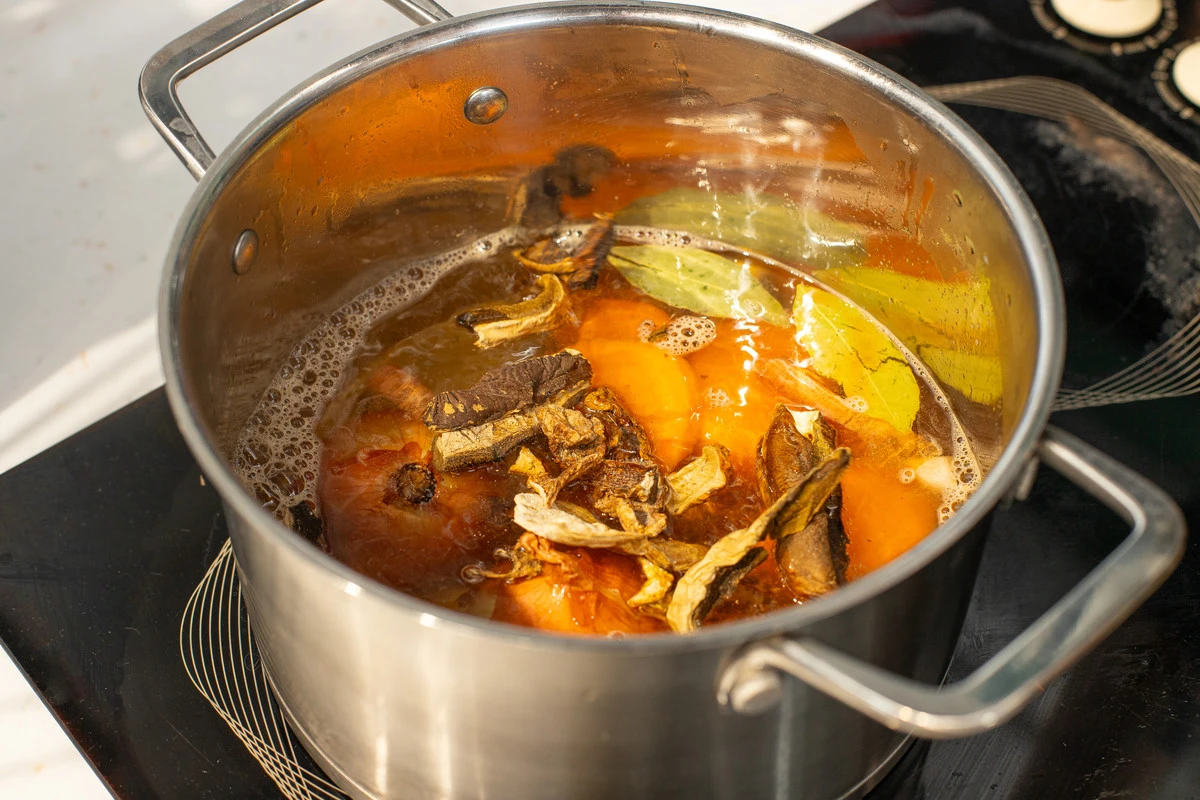 Разморозьте белые грибы. Репчатый лук помойте и разрежьте пополам. Можно оставить последний слой шелухи, она сделает цвет бульона насыщеннее. Морковь почистите и разрежьте на несколько крупных частей. Зубчик чеснока помойте и разрежьте пополам. Положите все подготовленные овощи в сухую кастрюлю без воды и масла. Добавьте лавровый лист, перец горошком, гвоздику. Готовьте овощи в сухой кастрюле на среднем огне до лёгких подпалин (примерно 5 минут или немного дольше).