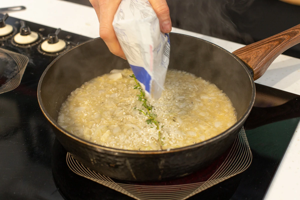 В Италии ризотто готовят из специальных сортов риса, но мы протестировали обычный круглозёрный — и всё получилось. Такой рис варится немного дольше, но если соблюсти технологию, то консистенция готового ризотто получится правильная. Замороженные белые грибы, а в сезон, конечно же, свежие из леса — классика ризотто.