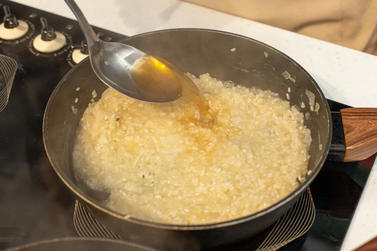 Налейте в рис немного бульона, перемешайте, подождите, пока впитается. Снова налейте немного бульона, перемешайте и подождите, пока впитается. Повторяйте в течение примерно 40 минут — к рису нужно добавить в общей сложности примерно 1 л бульона. Чтобы во время варки бульона было удобно набирать нужное количество для риса, придерживайте овощи с помощью сита. При необходимости можно подливать в бульон воду понемногу.