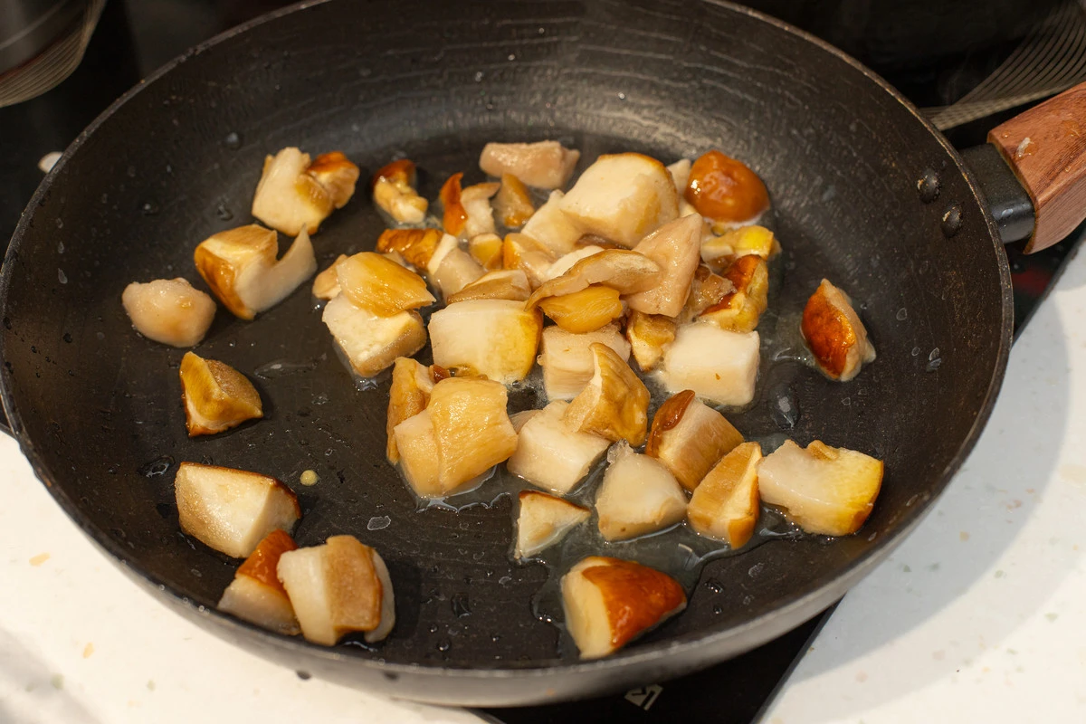 Размороженные белые грибы нарежьте кусочками размером примерно 1х1 см. Выложите на сковороду, чуть подсолите, по желанию добавьте щепотку кориандра — он усиливает аромат грибов. Готовьте в течение примерно 10 минут на среднем огне до золотистого цвета, при необходимости помешивайте.