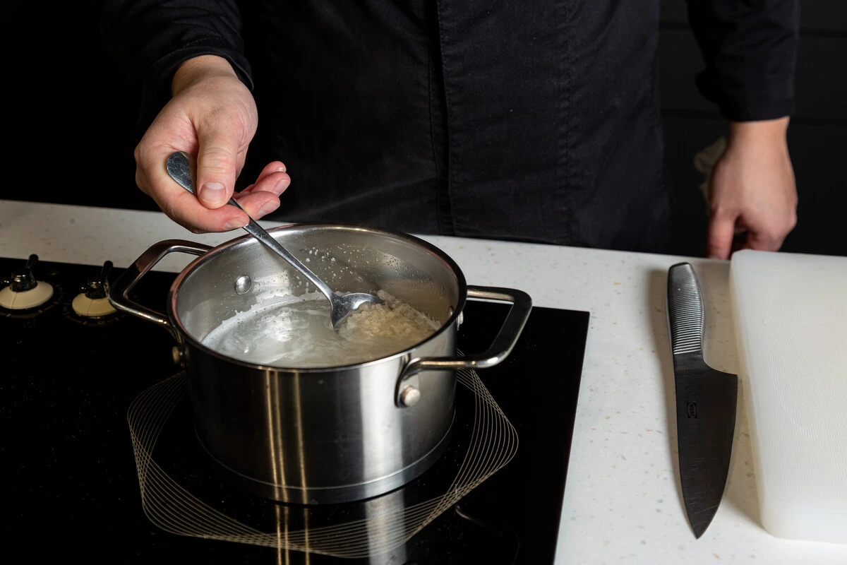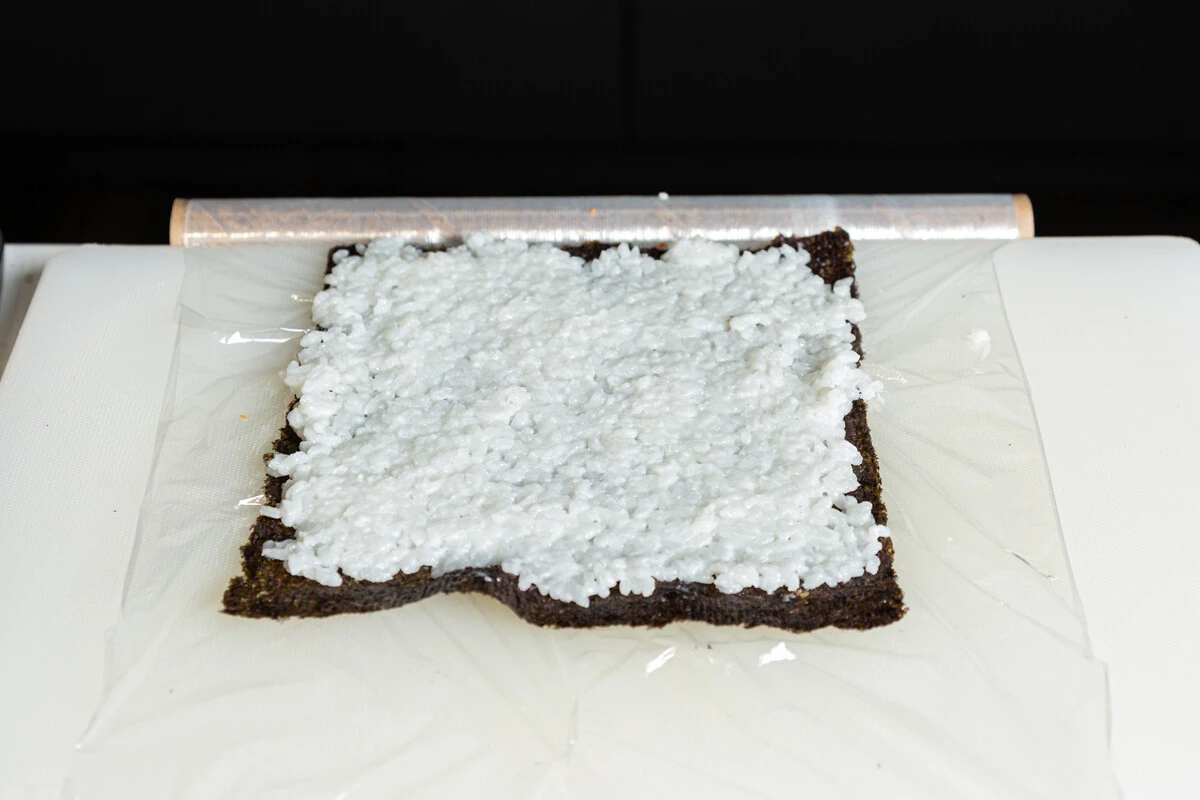 Выложите лист нори на рабочую поверхность, застеленную пищевой плёнкой. Распределите рис равномерно по поверхности листа нори.