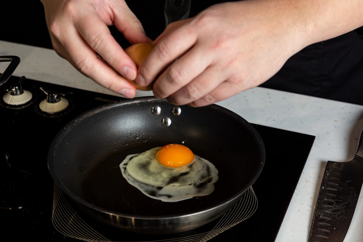 Из яиц приготовьте тонкий омлет. Для этого разбейте их на разогретую и слегка смазанную маслом сковороду.