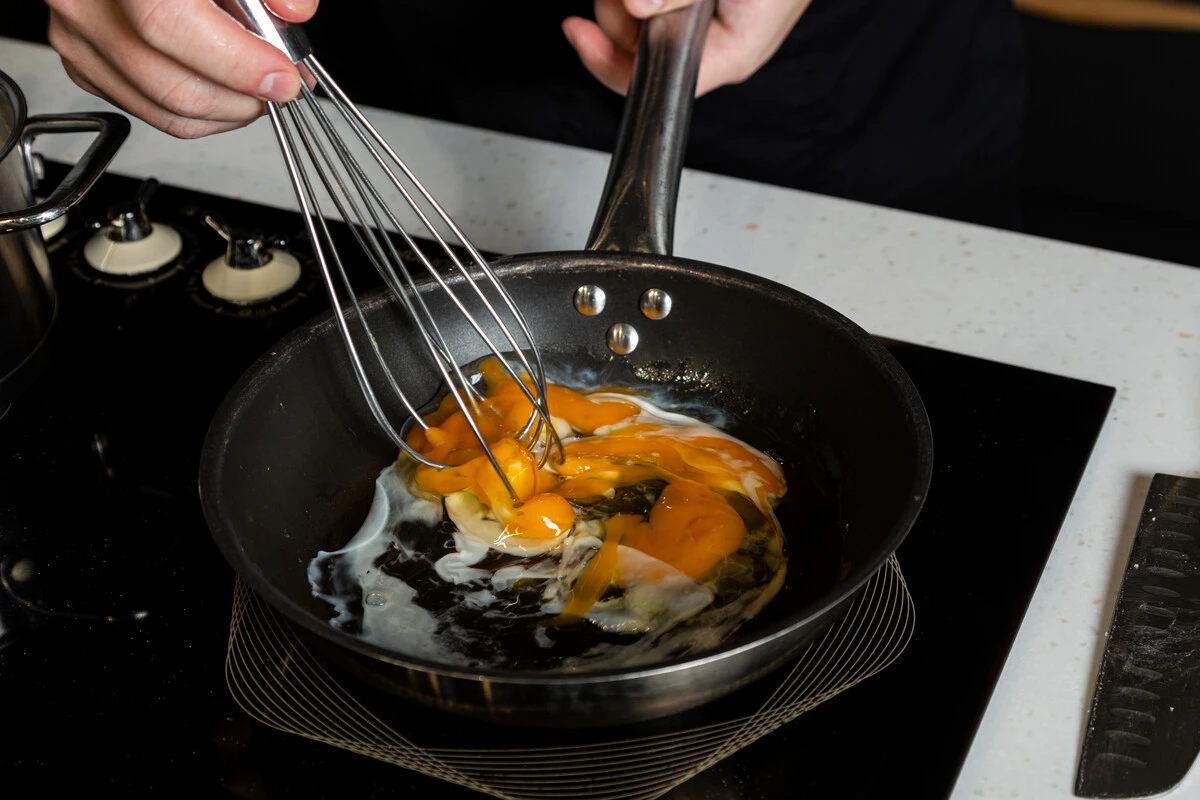 Затем, пока яйца не поджарились как следует, начните аккуратно размешивать массу прямо на сковороде с помощью лопатки или венчика.