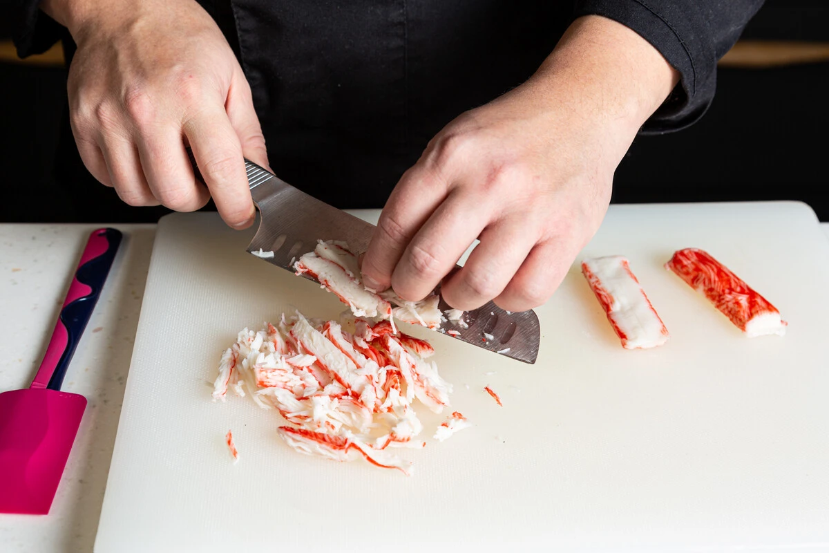 Крабовые палочки, ветчину, огурцы, шпинат и омлет нарежьте тонкой соломкой.