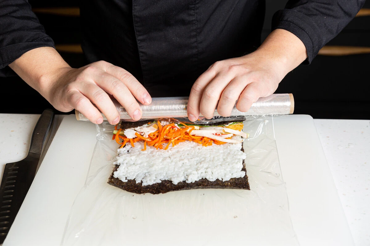 Выложите на рис все остальные ингредиенты ровным слоем у ближнего к вам края и скатайте в ролл.