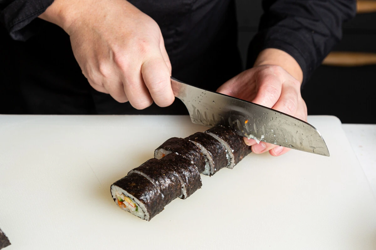 Разрежьте кимбап на небольшие кусочки и подавайте со смесью соевого соуса и кунжутного масла.