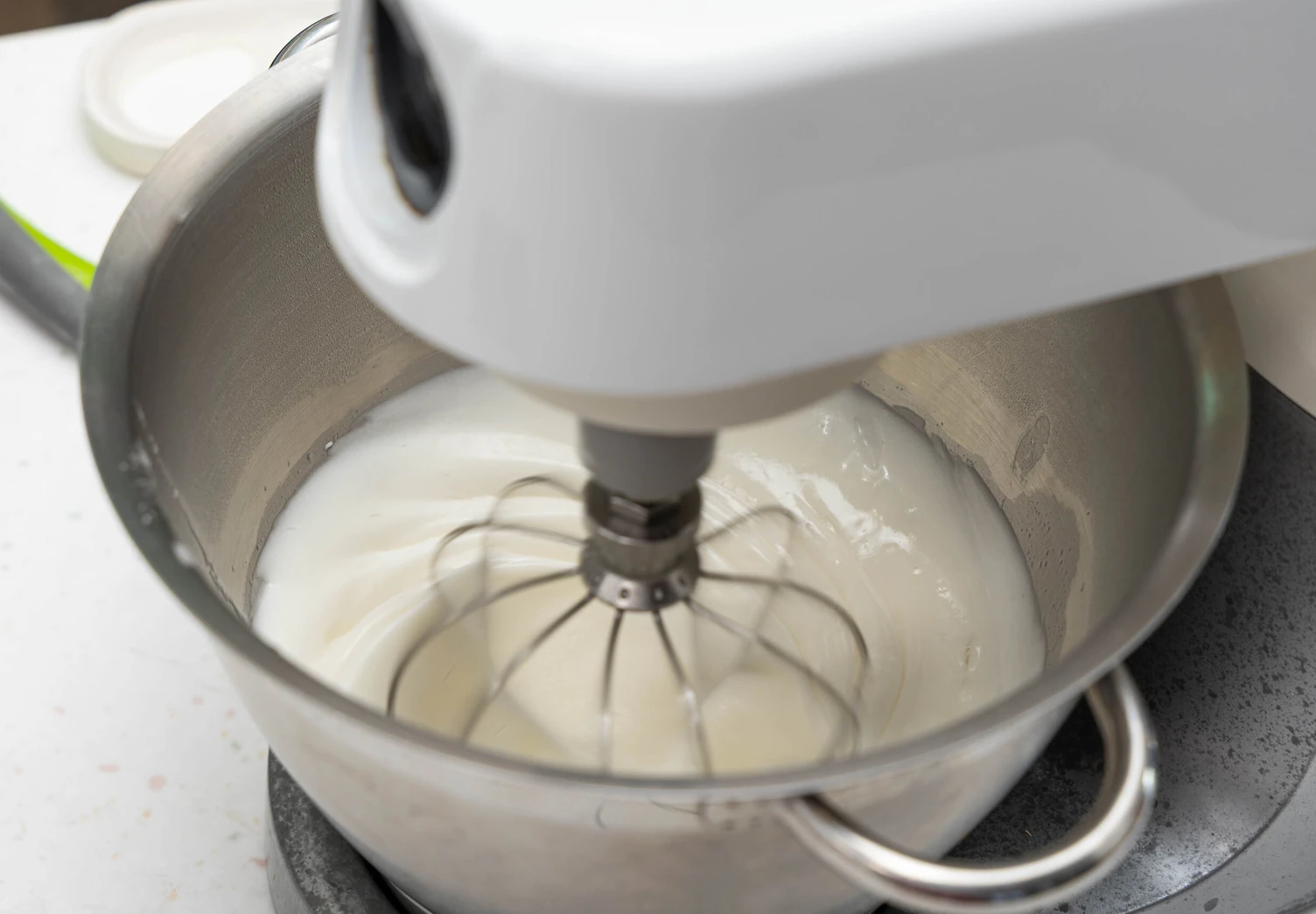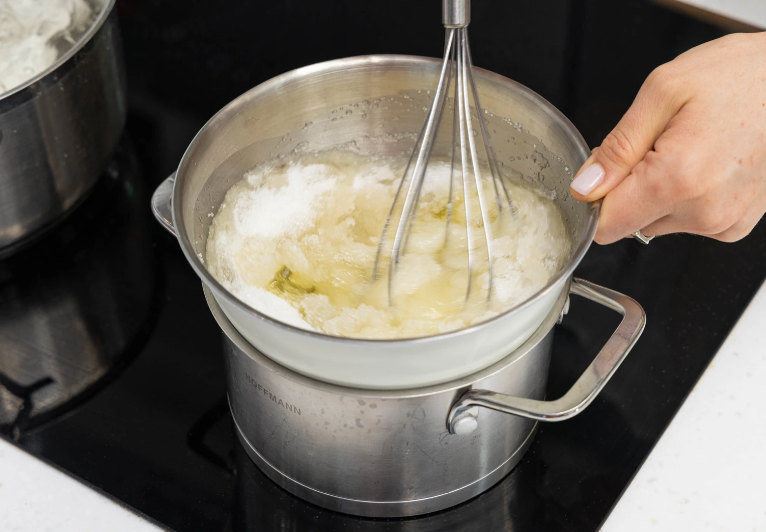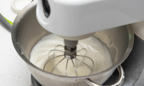 Как только масса достигнет 65 °C и все кристаллы сахара растворятся, снимите миску с огня и продолжайте взбивать белки миксером на средней скорости до устойчивых пиков.