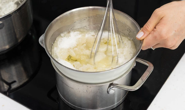 Белки смешайте с сахаром и лимонным соком и начните взбивать на водяной бане миксером.