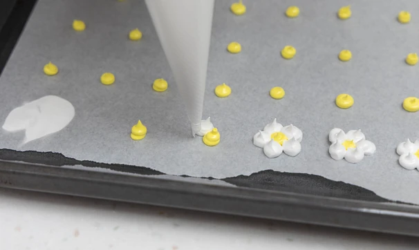 С помощью кондитерского мешка отсадите на противень, застеленный пергаментом, сначала серединки ромашек, затем лепестки. Можно использовать маленькую насадку с круглым отверстием, а можно обойтись и без неё, просто отрезав ровный кончик у мешка.