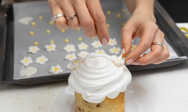 Выпекайте ромашки в духовке, разогретой до 60–90 °C, в течение 1–1,5 часа и украсьте кулич получившимся безе.