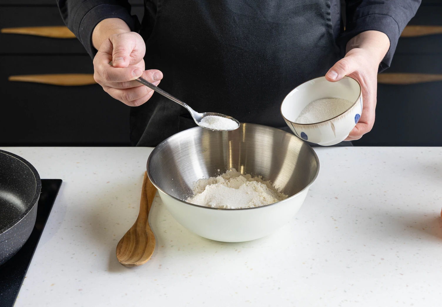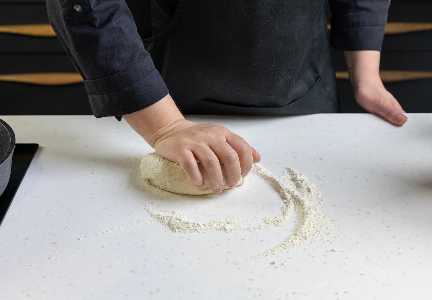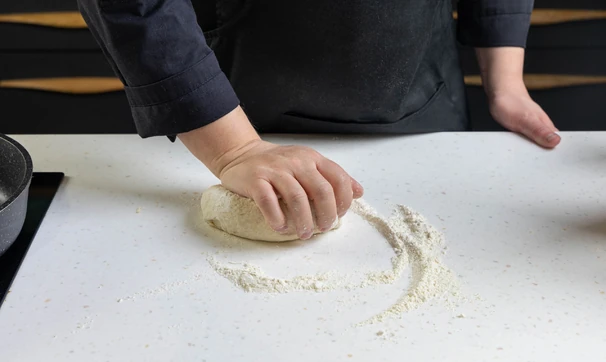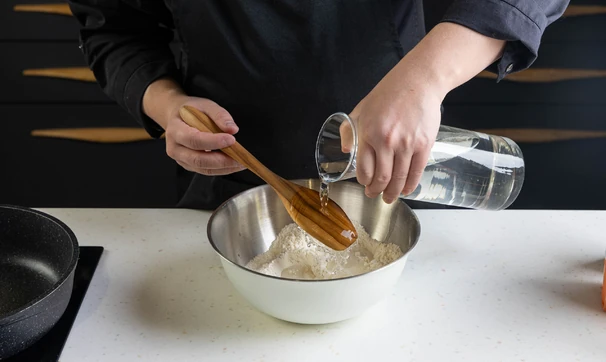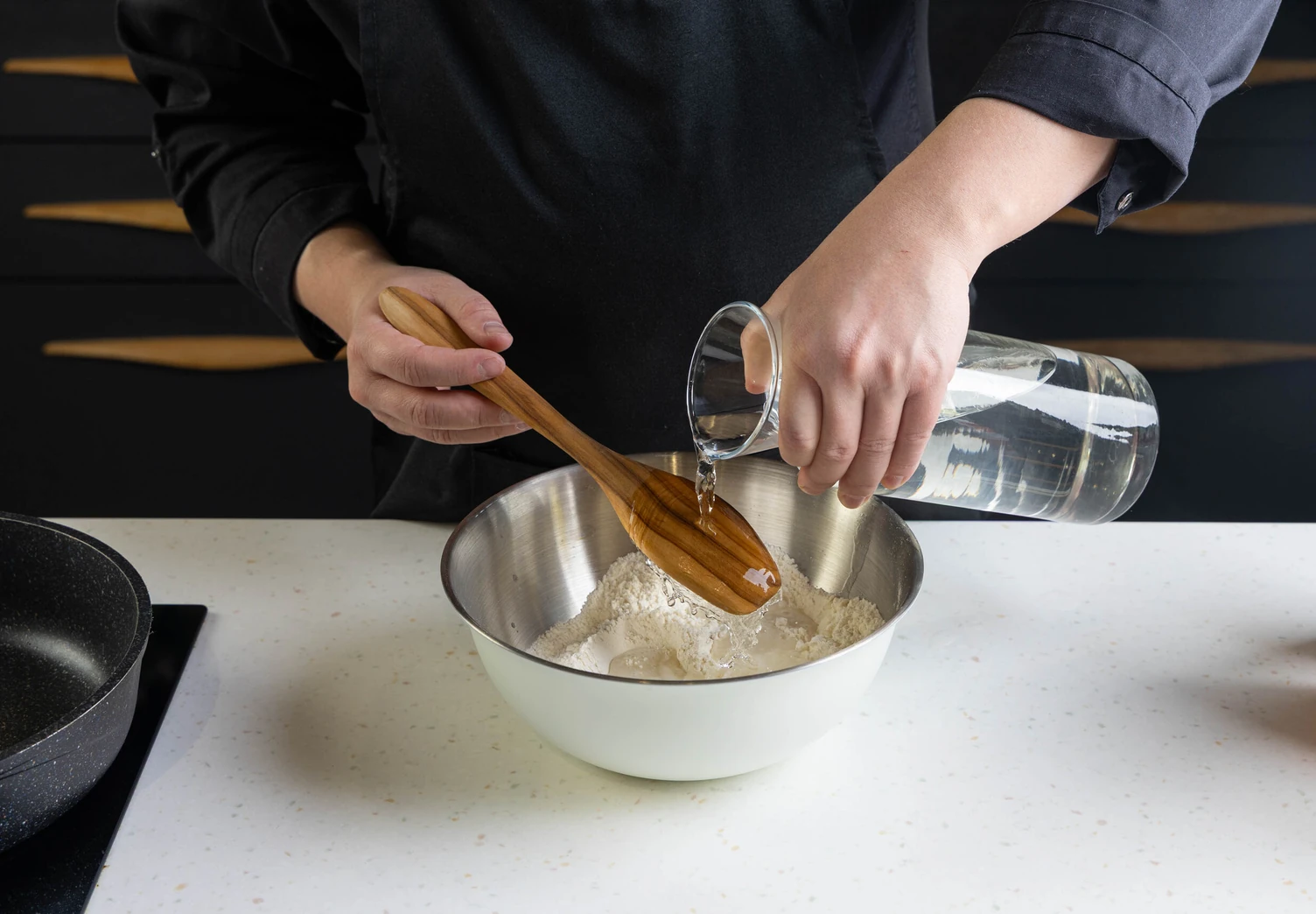 Начните понемногу вливать тёплую воду, каждый раз перемешивая тесто ложкой или рукой. Продолжайте добавлять жидкость, пока оно не соберётся в упругий эластичный шар. Тесто не должно липнуть к рукам.