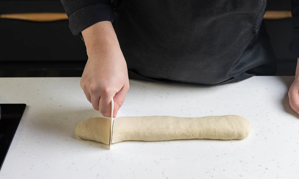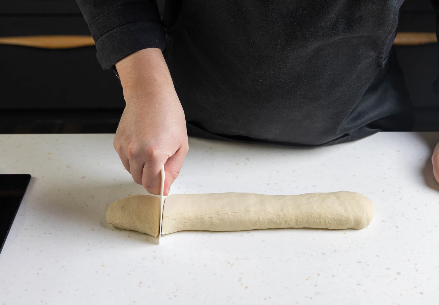Отдохнувшее тесто скатайте в длинную колбаску и разрежьте ножом на 10–12 одинаковых кусочков.