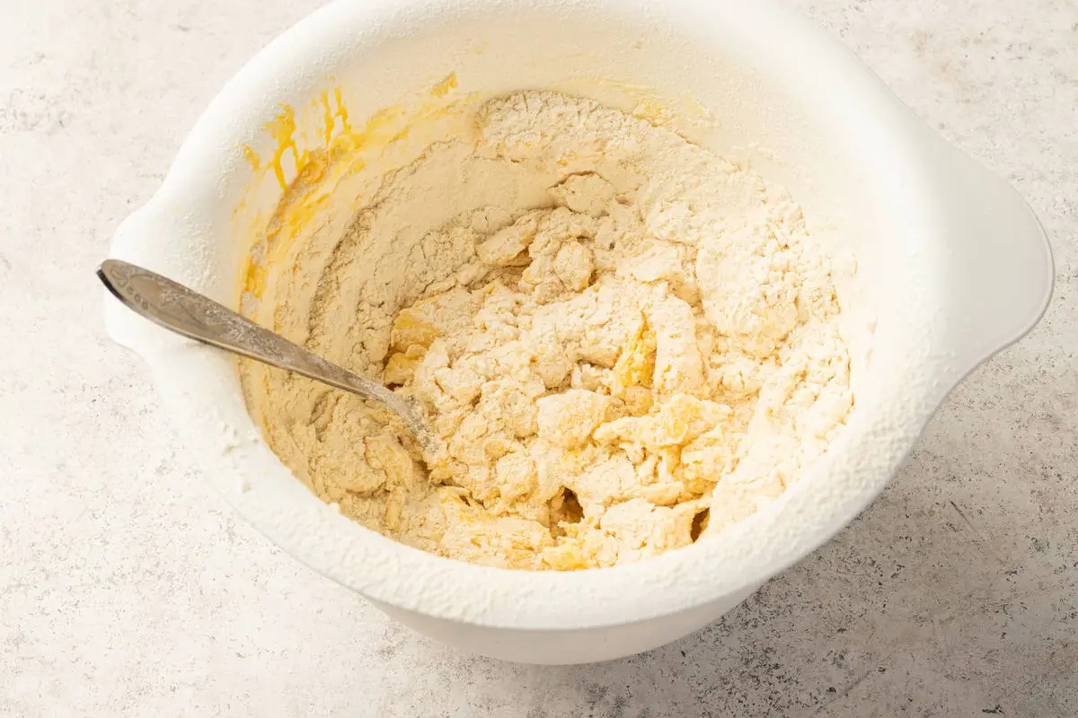 Просейте муку в масло и перемешайте ложкой: сначала получится крошка, а потом тесто начнет слипаться. Не перемешивайте до однородности, иначе потеряется нежность. Соберите тесто в ком и поставьте в холодильник на полчаса.