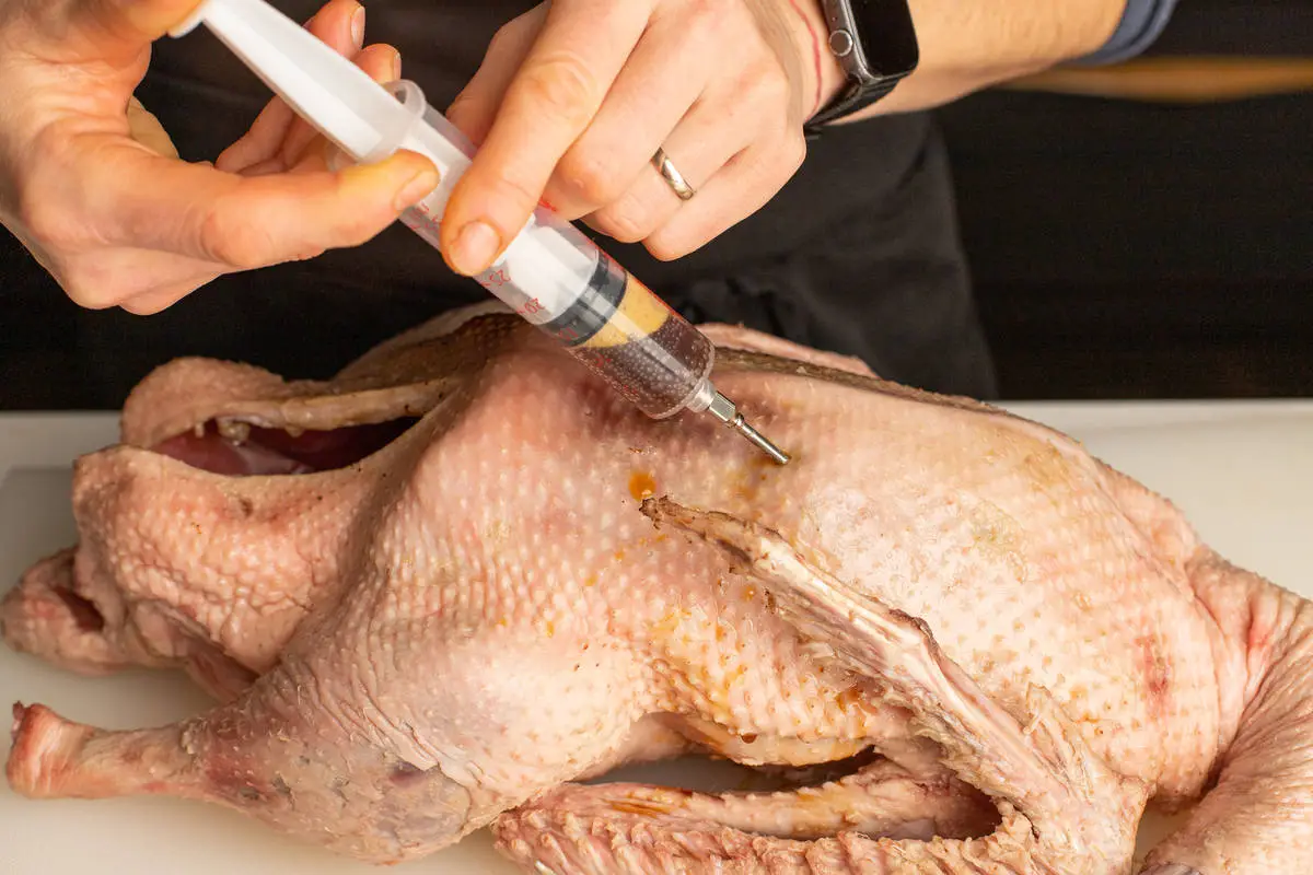 Получившуюся смесь вколите под кожу птице при помощи кулинарного (или обычного медицинского) шприца. Оставьте гуся мариноваться на ночь.