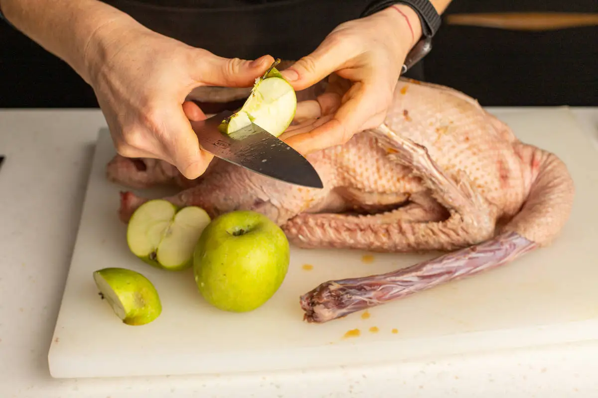 Яблоки нарежьте четвертинками, удалив сердцевину, курагу промойте. Начините птицу яблоками и курагой.