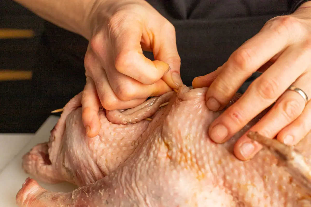 Скрепите края отверстия зубочистками. Гуся выложите на противень (без пергамента) грудкой вниз.