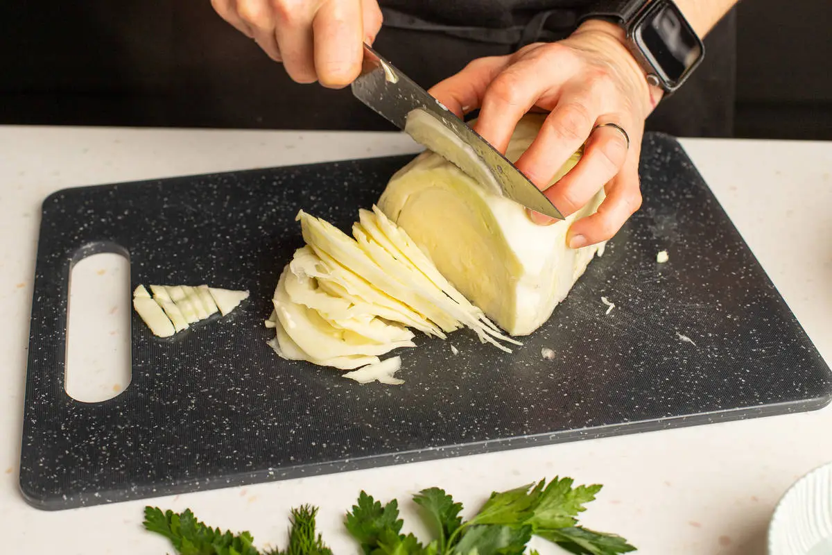 Пока гусь запекается, самое время приготовить гарнир. Красный лук нарежьте перьями, капусту тонко нашинкуйте.