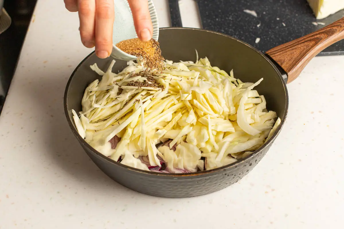 В толстостенной сковороде обжарьте лук на небольшом количестве жира от гуся до золотистости. Добавьте капусту, уксус, соль, сахар и специи, тушите 20-25 минут до готовности на среднем огне под крышкой.