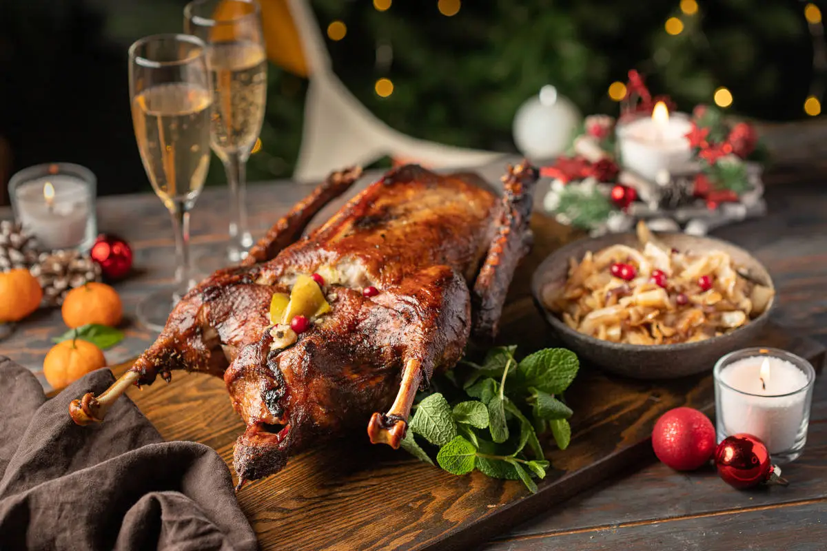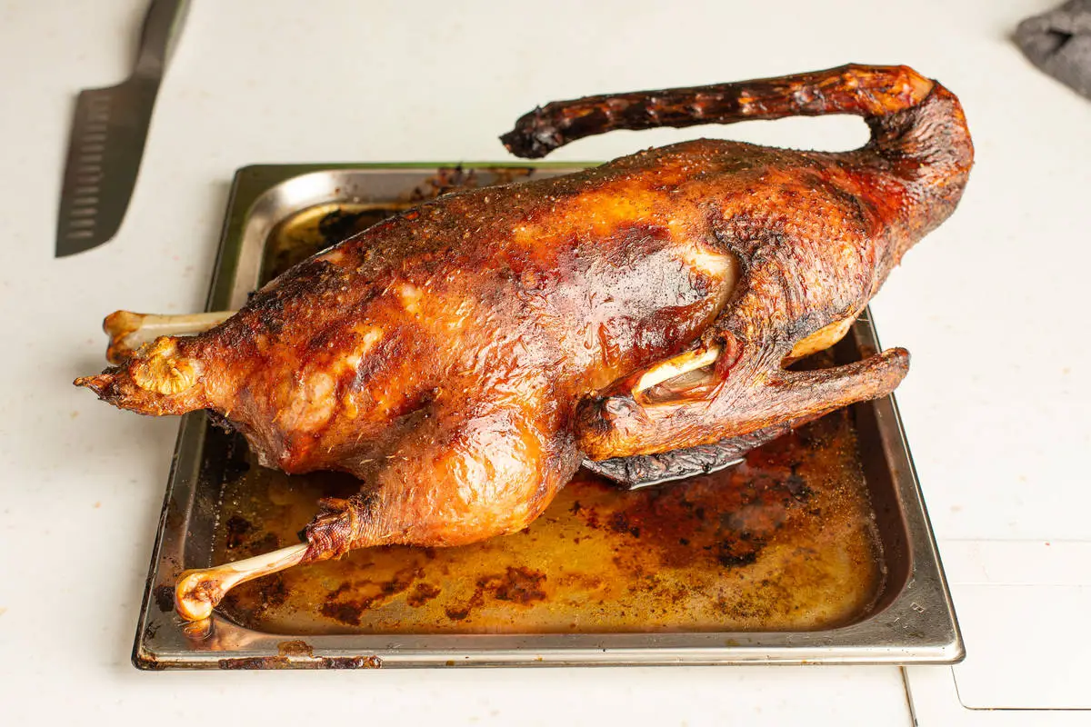 Гусь не терпит спешки и суеты при приготовлении, требует длительной подготовки и медленного запекания. Зато в результате получается по-настоящему роскошное праздничное блюдо. На гарнир мы рекомендуем приготовить тушёную капусту, добавив в неё немного жира от гуся — это классическое и очень вкусное сочетание.