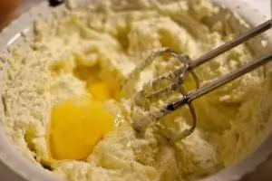 Сливочное масло взбейте с сахаром до бела при помощи миксера, добавляйте яйца по-одному, каждый раз тщательно взбивая массу, затем постепенно всыпайте муку, просеянную с разрыхлителем.