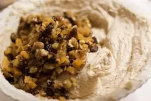 Набор сухофруктов может быть любым, основа — изюм темный и светлый, остальное по вашему желанию, у нас: чернослив, курага, апельсиновые цукаты, вяленая груша, сушеная вишня. Все сухофрукты нужно порезать кусочками и залить любым ароматным алкоголем, это может быть ром или херес например, оставить на ночь или больше. Достаньте продукты из холодильника заранее, чтобы они приобрели комнатную температуру.