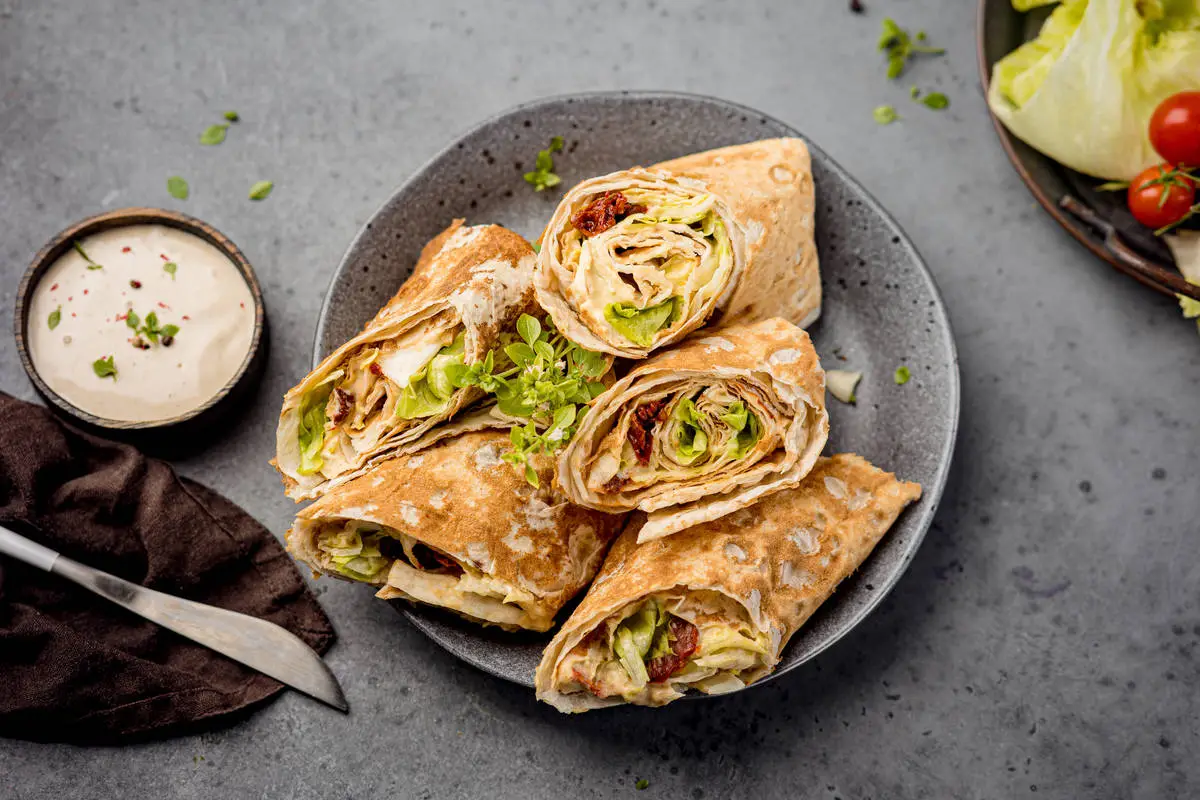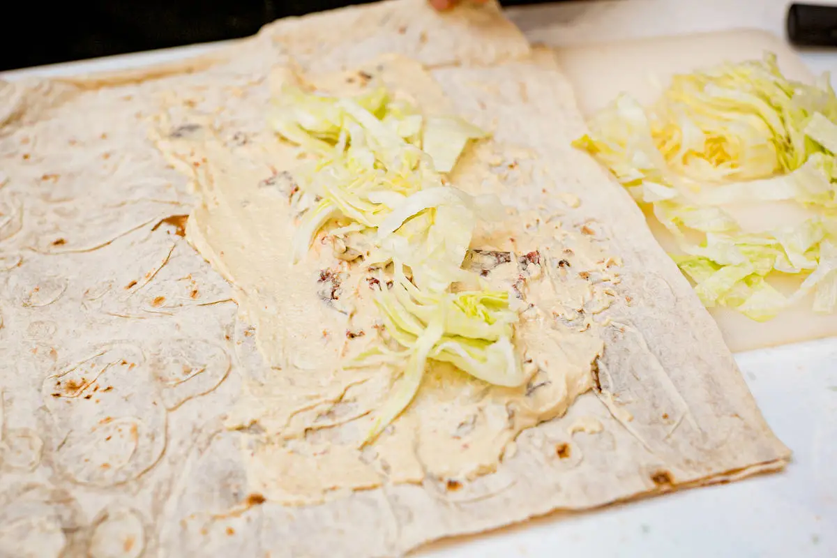 Листы лаваша намажьте хумусом. Вяленые томаты разрежьте пополам и разложите равномерно по лавашу, сверху добавьте листья айсберга для хруста.