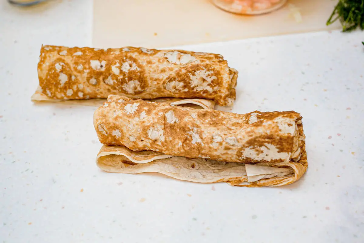 Короткие стороны лаваша загните на начинку, а затем скрутите лаваш по длинной стороне — и рулет готов.