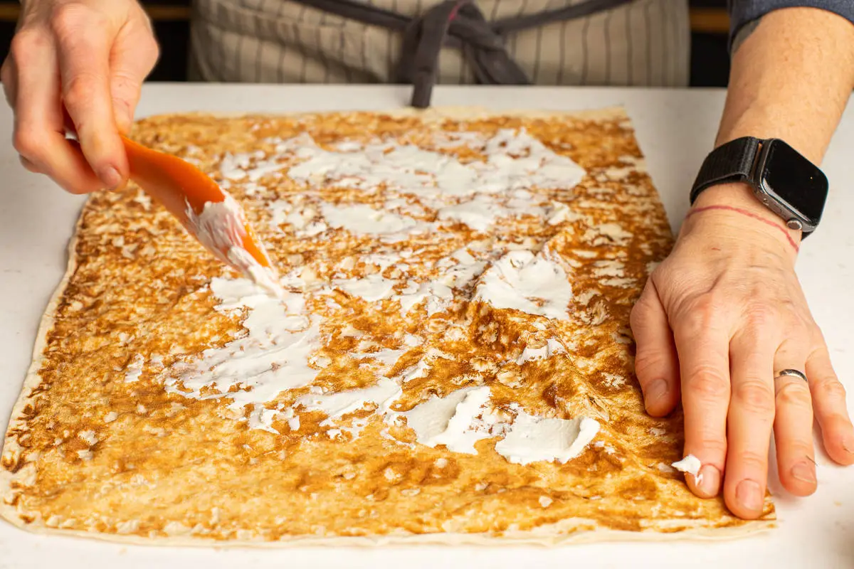 Лаваш разверните на столе, намажьте равномерно творожным сыром.