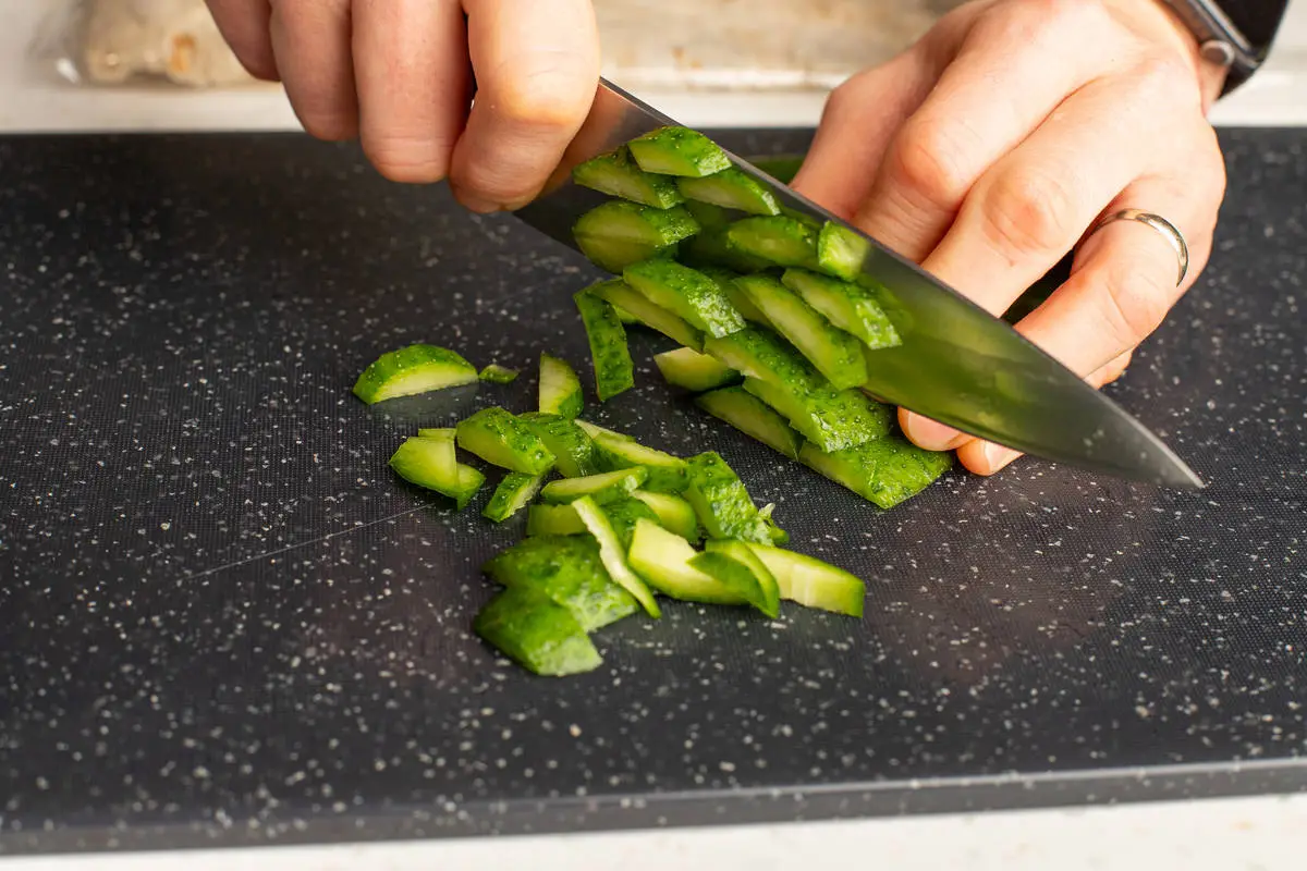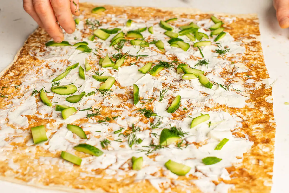 Аккуратно и плотно сверните рулет по длинной стороне лаваша.