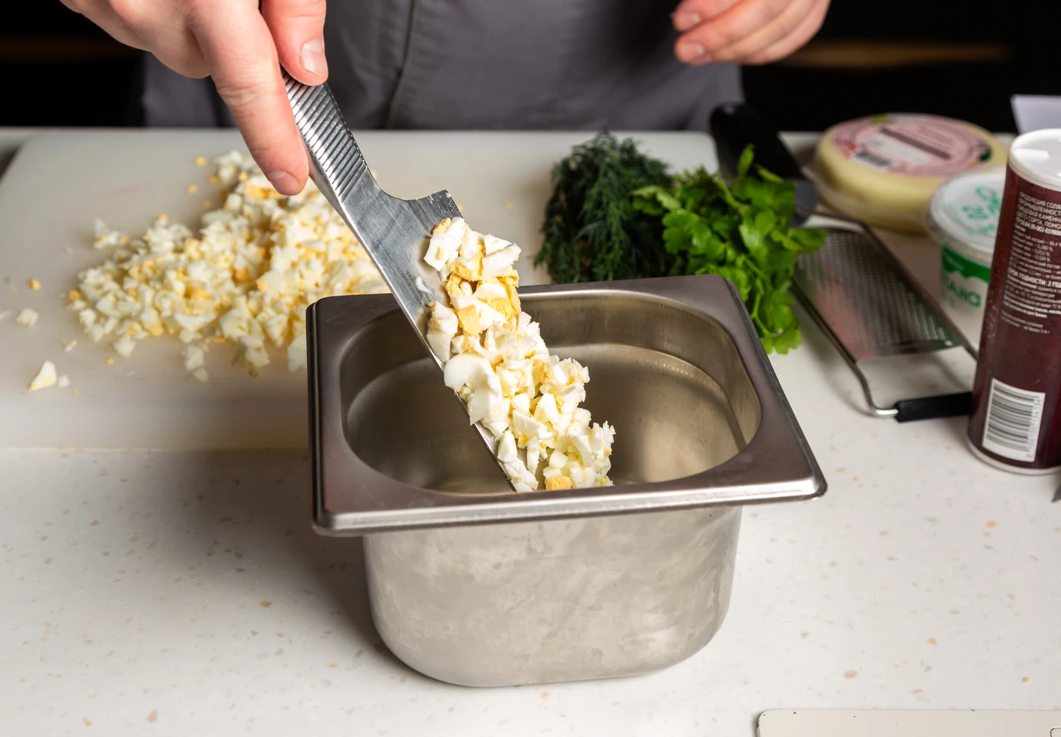 Смешайте натёртые яйца и сыр с зеленью, добавьте сметану и специи по вкусу.