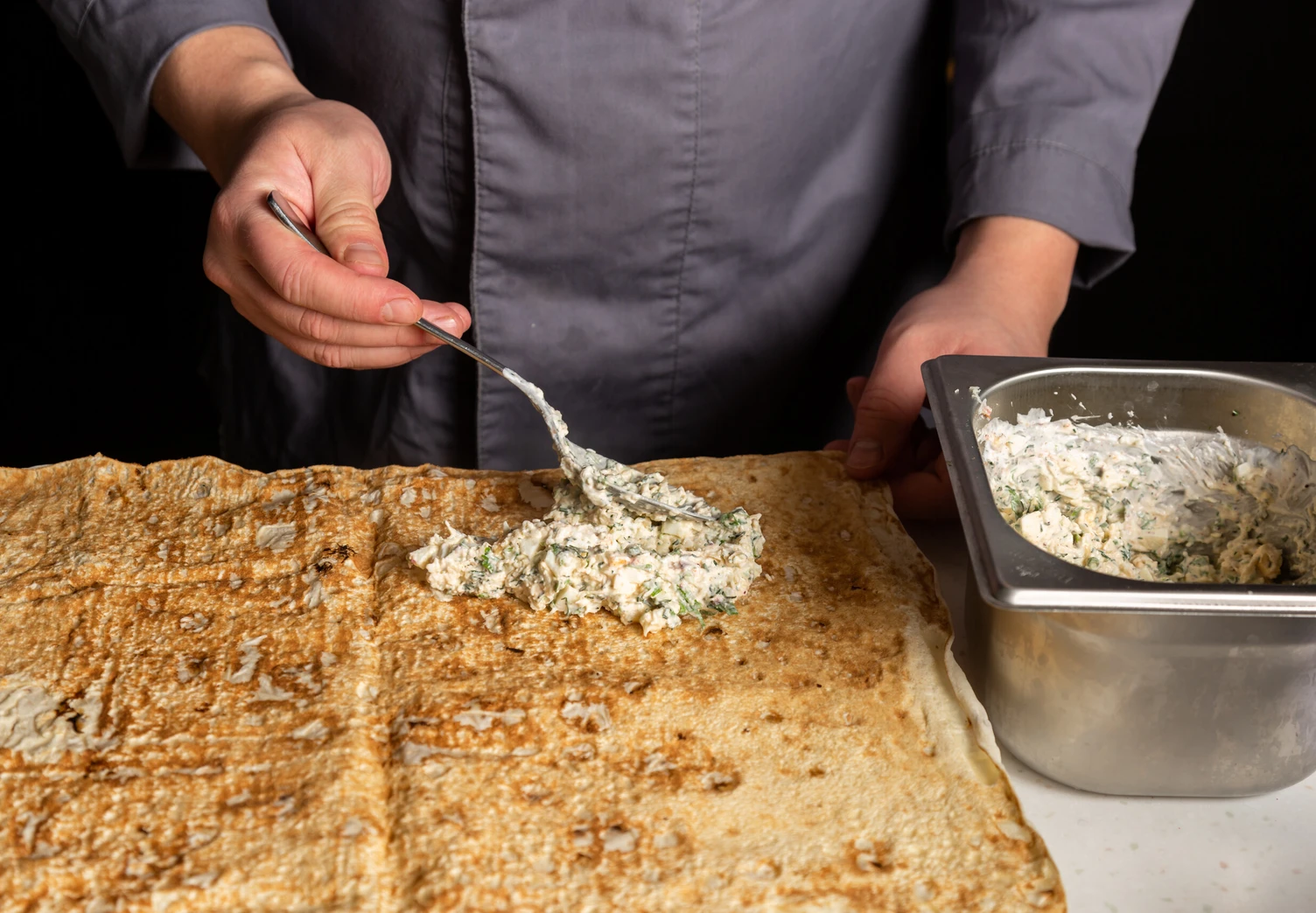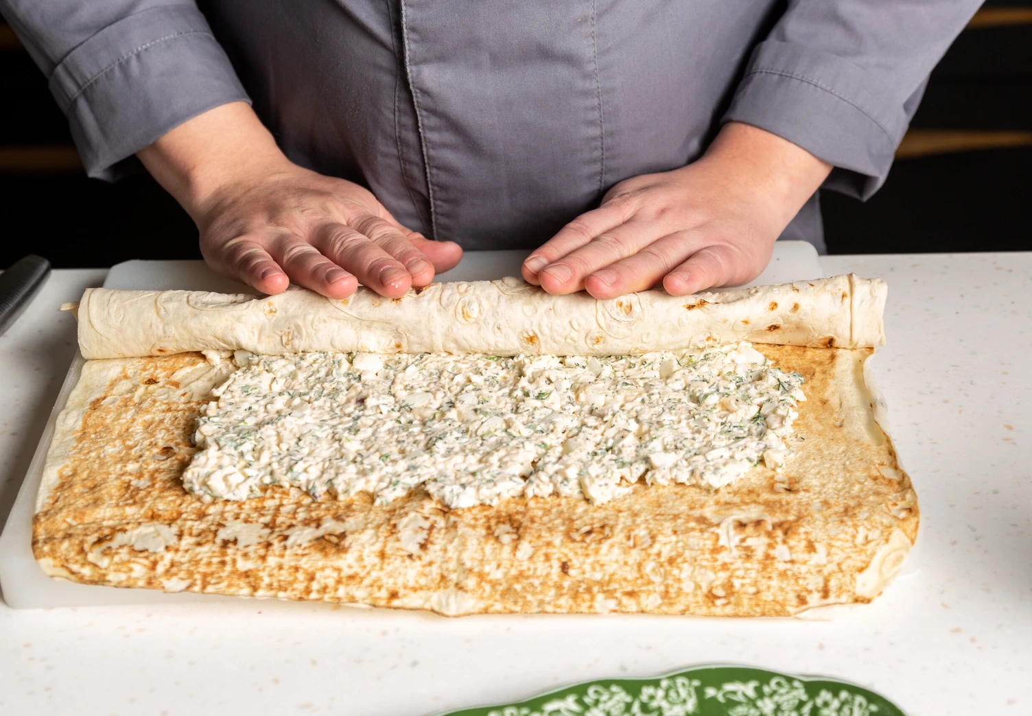 Заверните лаваш в рулет и нарежьте на порционные кусочки.