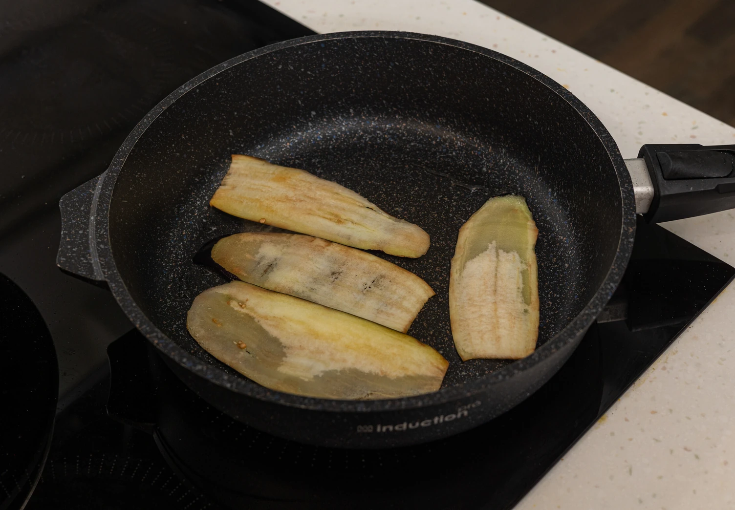 Нарежьте баклажаны тонкими полосками и подрумяньте их на сковороде, смазанной маслом. Чтобы убрать лишний жир, выкладывайте готовые ломтики на бумажное полотенце.
