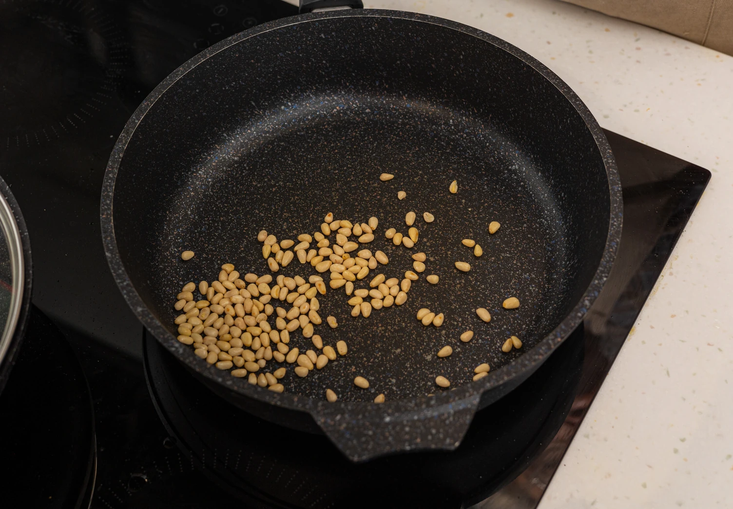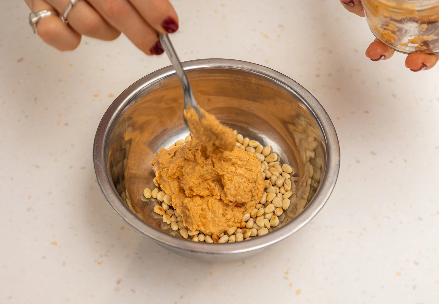 Смешайте поджаренные орехи с хумусом. По желанию можно также добавить в начинку халапеньо, вяленые томаты или запечённый чеснок.