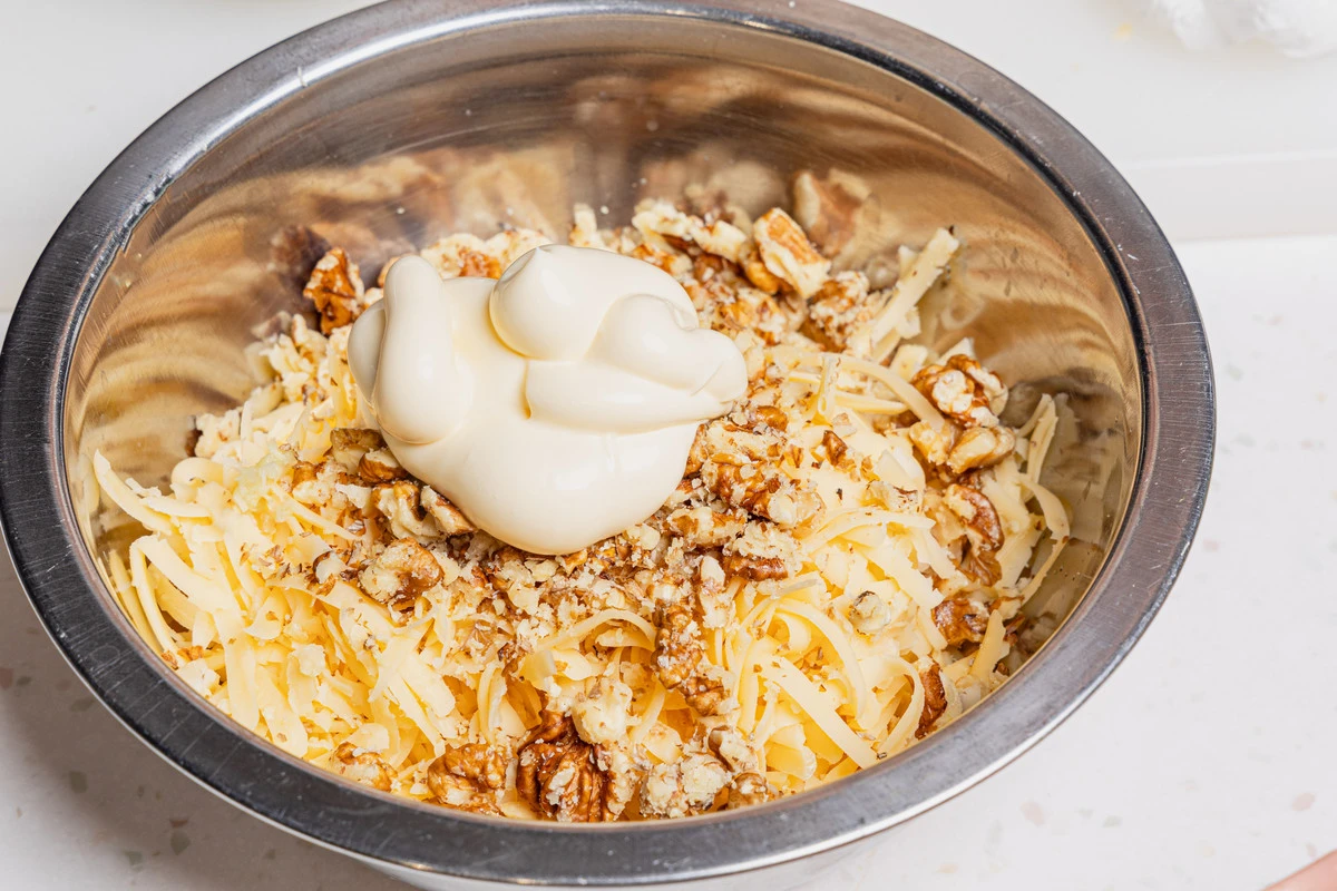 Орехи измельчите, чеснок пропустите через пресс. Добавьте орехи и чеснок к сыру, заправьте майонезом и перемешайте до однородности.
