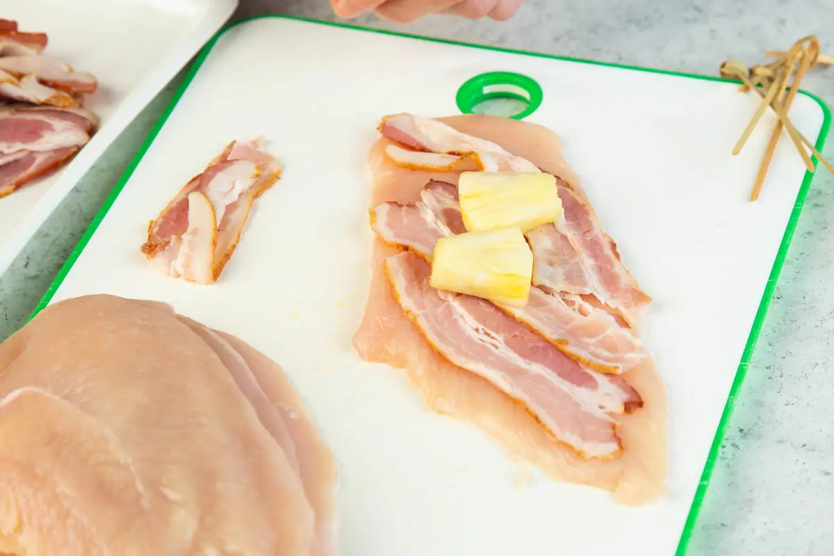 Половину ломтиков бекона разрежьте поперёк пополам, половину оставьте целыми. На каждый слайс куриного филе кладите половинку бекона и кусочек ананаса, заворачивайте в рулетик, сверху оберните целым кусочком бекона.